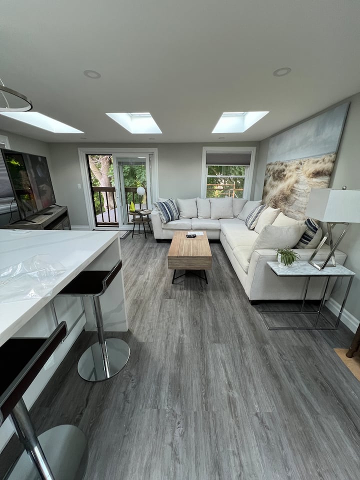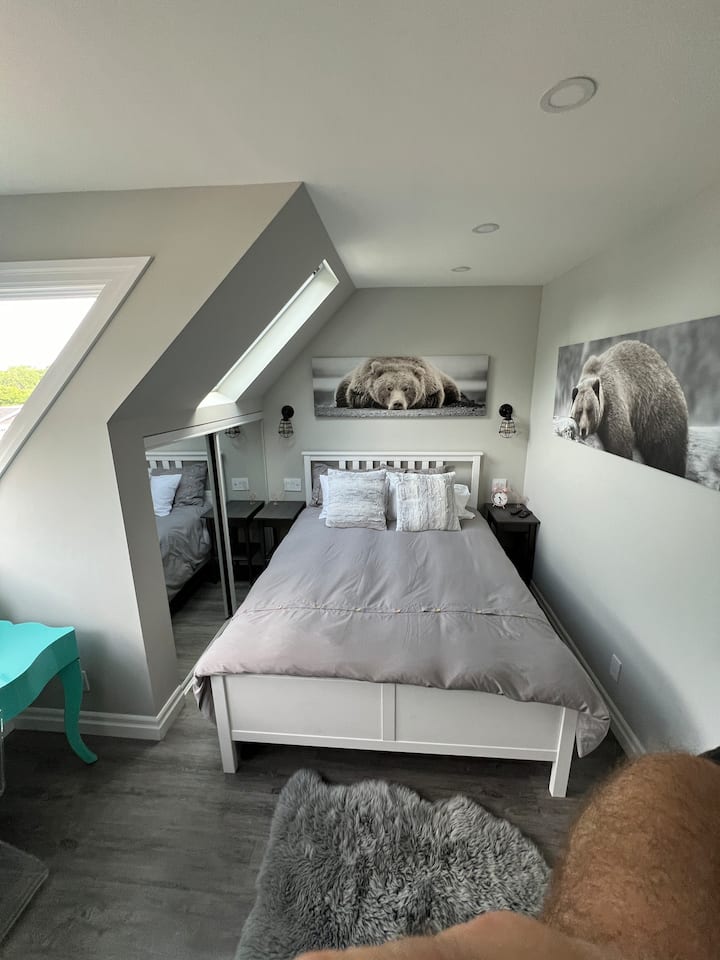 Toto je moderný krásne dokončený súkromný apartmán s vlastnou kúpeľňou, nedávno postavený, špičkové dokončenie, plne vybavený všetkým potrebným vybavením. Izba je orientovaná na ulicu alebo na prednú časť domu so samostatným súkromným vchodom. Obývacia izba má 65-palcovú televíziu so všetkými káblovými kanálmi balíka Rogers Extreme a službou Amazon Prime Video. Super rýchly internet.
