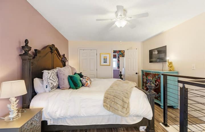 Spálňa s manželskou posteľou King sa nachádza na poschodí a zahŕňa plnú vaňu/sprchovací kút, 47-palcovú TV s plochou obrazovkou a tichý priestor na posedenie/šatňu.