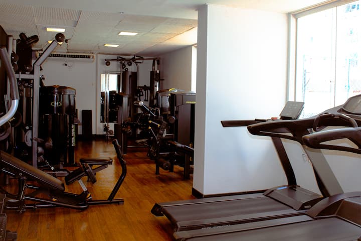 Dobre si zacvičte, veď sú tu k dispozícii bežecký pás, stacionárny bicykel, podložka na jogu a činky. Prečo to nevyužiť?