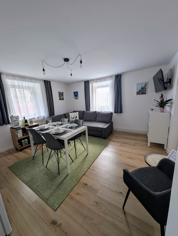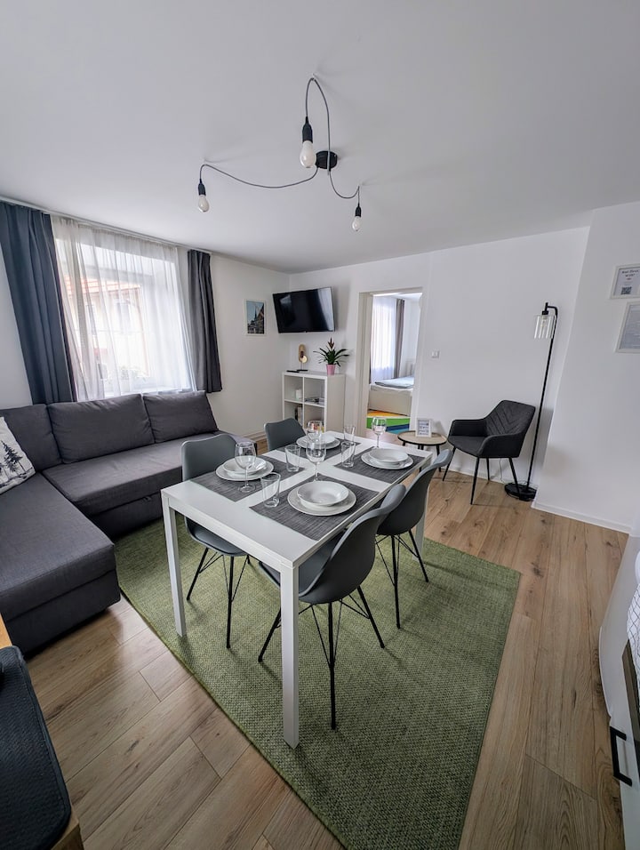 Veľká spálňa je manželská posteľ s rozmermi 180 cm, malá spálňa je 140 cm široká posteľ. Okrem toho sa na pohovke v obývacej izbe môžu ubytovať 2 hostia na 140 cm širokej rozkladacej pohovke.
