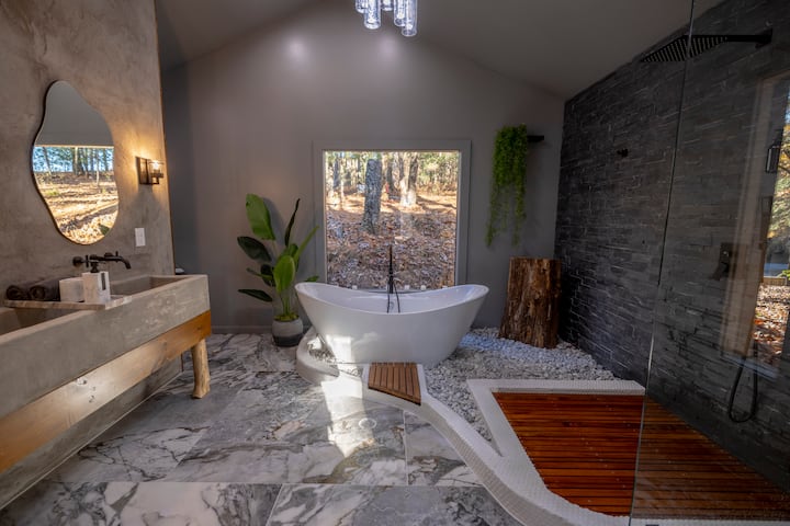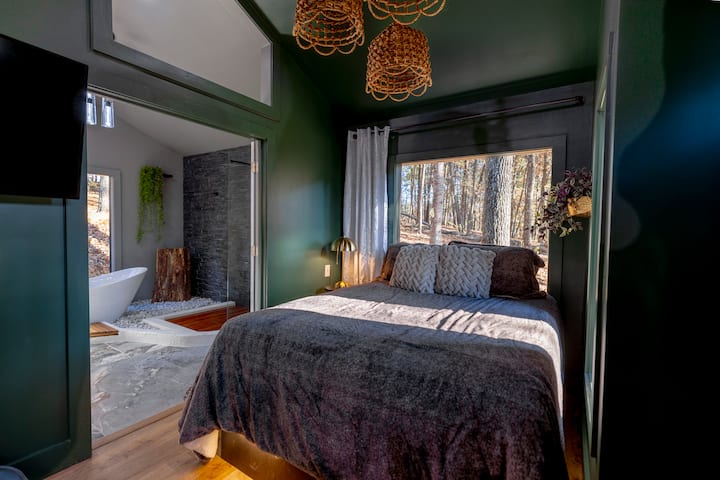Uniknite do luxusnej zrubu s 1 spálňou v pohorí Blue Ridge na súkromnom pozemku s rozlohou 2,91 akra. Vychutnajte si dokonalé súkromie a pokoj obklopený bujným lesom. Oddýchnite si pri krbe, jedzte pod šírym nebom a hrajte sa so svojimi domácimi zvieratami v prírode. Vnútri chaty s rozlohou 484 štvorcových stôp je k dispozícii HDTV s Netflixom, plne vybavenú kuchyňu a vysokorýchlostné Wi-Fi pripojenie. Ideálne na pokojný výlet alebo romantické útočisko.