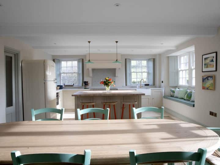 Živá vstupná hala vás zavedie do svetlej, vzdušnej a príjemnej kuchyne/jedálne, ktorá má niekoľko krásnych okenných sedadiel a tvorí srdce tohto úžasného statku. Táto svetlá a plne vybavená izba je ideálna na prípravu a zdieľanie širokej škály vašich obľúbených jedál. K dispozícii je celý rad spotrebičov vrátane sporáka s indukčnou varnou doskou, veľkej chladničky s mrazničkou, mikrovlnnej rúry a umývačky riadu, ako aj úžasného jedálenského stola ideálneho na slávnostné jedlo. Práčka a sušička sa nachádzajú v technickej miestnosti, ktorá je ideálnym priestorom na odkladanie kabátov a topánok plných bahna. Na prízemí je krásny útulný kútik s inteligentnou TV a množstvom miest na sedenie. K dispozícii je tiež prvá z piatich spální objektu (vrátane prístavby): pekná dvojlôžková izba, ktorá môže byť na požiadanie vybavená posteľou veľkosti super king, spolu s vlastnou kúpeľňou so sprchovacím kútom a WC. Na prízemí sa nachádza aj samostatné WC.