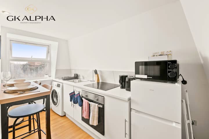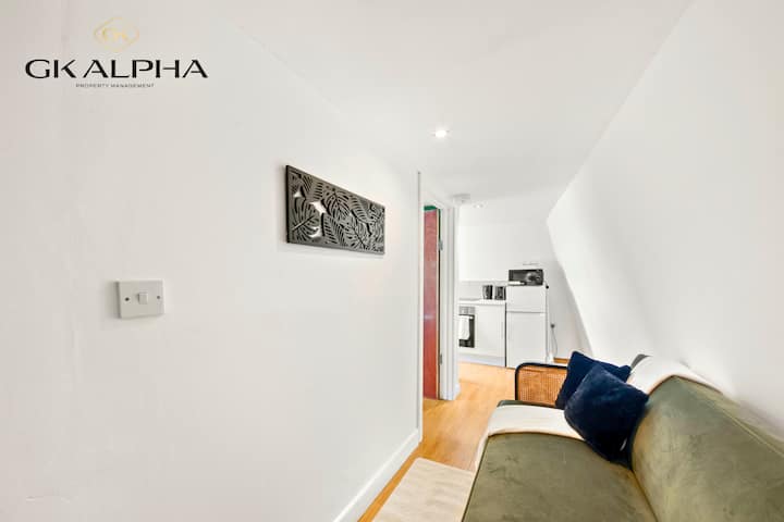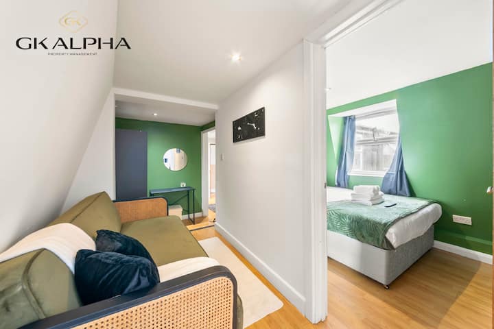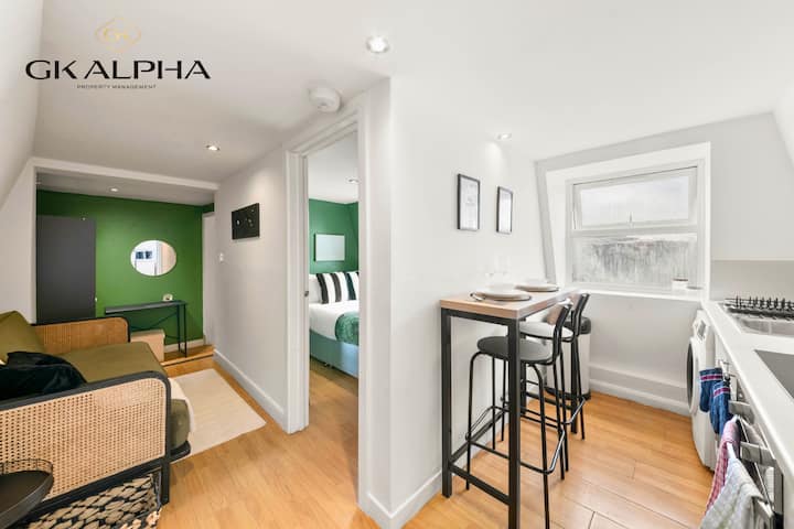 Vitajte vo svojom útulnom londýnskom útočisku, kde sa pohodlie stretáva s luxusom! Bezkonkurenčná poloha s pohodlným prístupom k O2 Shepherd 's Bush Empire, Paddingtonu a centrálnemu Londýnu. Keďže je v blízkosti viacerých pracovísk, slúži ako ideálny domov pre dodávateľov, IT odborníkov, inžinierov a digitálnych nomádov. Tento svetlý apartmán s jednou spálňou má upokojujúcu zelenú a bielu tému. V celom objekte sú drevené podlahy a okná s krídlovými dverami udržujú celý apartmán jasne osvetlený.
