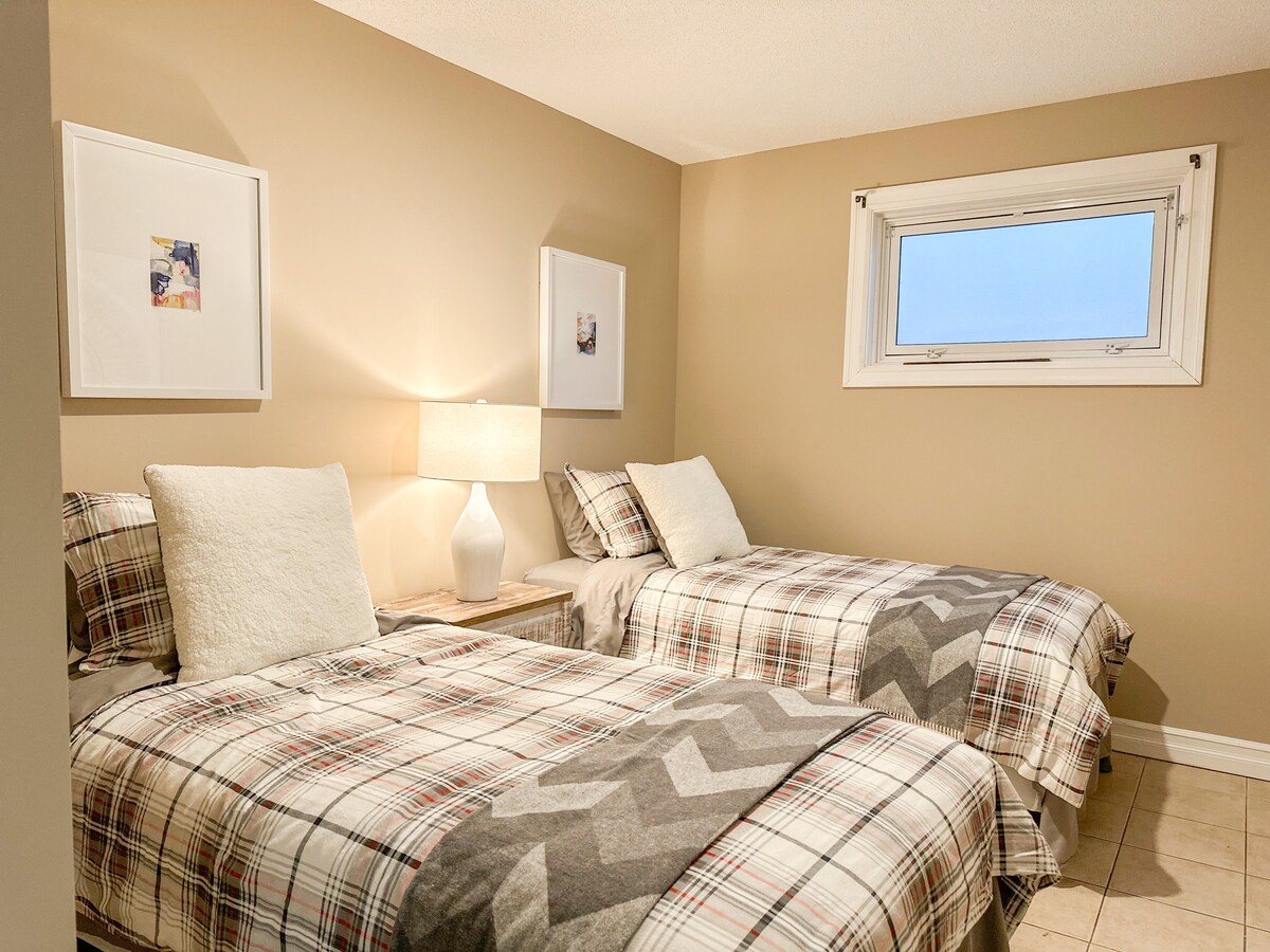 Apartmán vhodný pre rodiny v Queen Alexandra! Toto priestranné suterénne útočisko sa nachádza len 5 minút od športového centra Kinsmen a je ideálne pre rodiny. Užite si vlastný vchod, inteligentná televízia, rýchle Wi-Fi, plne vybavená kuchyňa, a jednoduché samoobslužné ubytovanie. Jedna spálňa má manželskú posteľ, ďalšie dve dvojčatá - skvelé pre deti (so zatemňovacími žalúziami!). Prejdite na Whyte Ave, U z A, kaviarne a parky. Útulná, tichá základňa pre športové podujatia, pobyty alebo predĺžené pobyty.